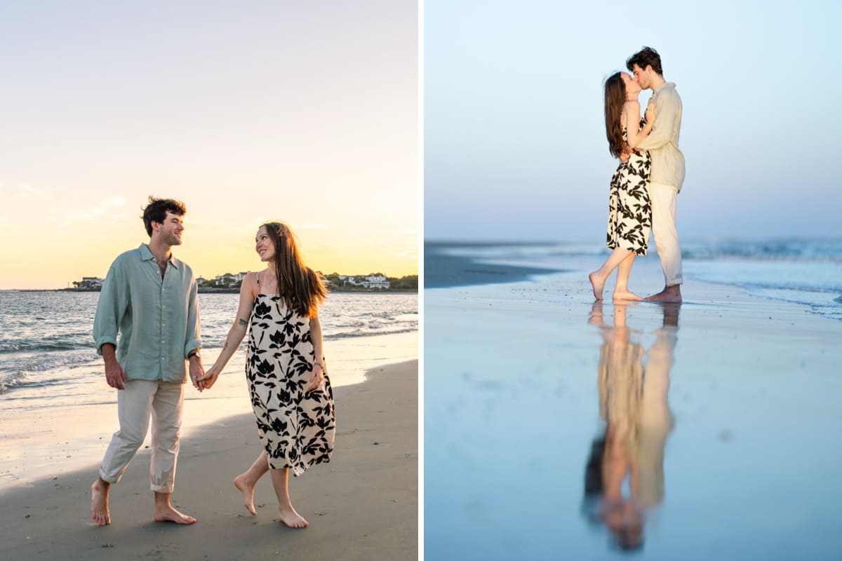 Some proposals are simply picture-perfect — and Hunter’s sunset engagement to Melissa at Beach Inlet was exactly that. On September 24th, under the golden glow of a Charleston sunset, Hunter dropped to one knee near the public beach access by the bridge that connects Isle of Palms and Sullivan’s Island. The view, the lighting, and the moment itself were truly magical.